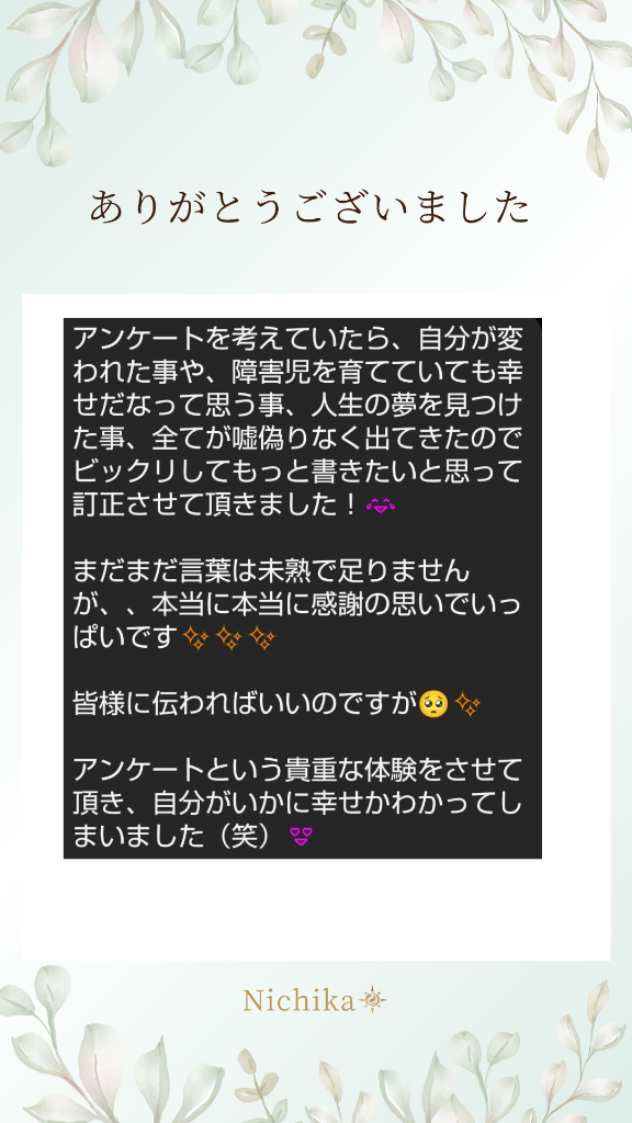 お客様より頂いたアンケートをご紹介致します。●お子様の状況・お悩み娘には障害があります、意味のある言葉を発する事は難しく、移動は出来ますが立つ事歩く事は出来ません。日常生活の多くにお手伝いが必要な状態です。上の子を育てた事はあるものの、上の子では感じたことのないような育児の悩みが娘では生じていました。喋る事が出来ないので、娘が何を訴え要求しているのか理解することが出来ず、途方に暮れる事も多くありました。●お子様と出会い日賀さんとのセッションは基本私が1人の時に行っていました。たまたま予定が合わず、娘が家にいる状態でセッションを行う事になりました。内心「子供がいない方がスムーズにセッションできるのにな。。」なんて考えていました。●セッション中の偶然な出来事セッションが始まりいつもの様に日賀さんとお話をしているのですが、話の核心に差し掛かると娘が泣き始めるのです。それも尋常ではない泣きっぷり。異常を察した日賀さんは「大丈夫?どうしたの?教えて?」って娘に話しいて、、「娘話せないのに???」なんて思っているのですが、娘は必死になって何かをギャーギャー訴えているのです。。。私の頭はパニックです、喋れない娘が日賀さんとお話しようとしてるの???正直半身半疑でした(ごめんなさい笑)。でも、また後日のセッションでもそんな状態が何度も何度も訪れるのです。言葉にならないけれどとにかく叫んで、必死に泣いて。普通に考えたらどこか痛いところでもあるのではないかと思うのですが違うのです。(数日、泣いて叫ぶ事は時々あり、その度に病院へ行き検査もするものの『検査上は問題ないと』言われ帰ってくる事が多くありました。血液・脳波・MRI・CTの検査をした事もありました)日賀さんが話しかけてくれて娘からの訴えをどんどん拾ってくれて「こうして欲しいの?」と日賀さんが正解を言い当ててくれると「YES」と言わんばかりに娘は満足したようにピタッと泣きやんで穏やかな様子になり、自由に子供らしく遊び始めます。そんな出来事が不思議な事に毎回です(笑)半身半疑な私も信じざるを得ない現実でした。今ではあまりにも物分りの悪いママはほっておいて日賀さんに目線で合図までするようになりました。「あれだよ!みてよ!」と。重度の精神面の障害があり、意味のある言葉がほぼほぼ出ない子です。●お子様からのご相談日賀さんとのセッションでは娘の不穏についても相談する事も多いのですが、今では、自分の悩みに対しても、普段私の姿を見ている娘がいた方がスムーズに解決する事が多く、日賀さんが娘と話してくれています。ママの私は娘が何言ってるのかまだ不明です(笑)言葉が発せられないから訴えがないわけではなく、日賀さんが「娘さんがちゃんとに話してくれる!」と教えて下さってから、私も娘の訴えをしっかりと聞く努力をするようになりました。●セッション後まだまだ全てを理解できませんが、意思疎通が少しでも出来るように頑張っていこうと思える出来事でした。泣いて訴えている娘を見て「必死に訴えてて偉いね!可愛いね!」とも言ってもらえました。今までは途方に暮れていただけな私だったのですが、そんな姿も愛おしく思えるようにもなりました。娘と話せるって考えもしませんでしたが、新たな目標が出来てとても嬉しいです。障害自体が解決したわけではないのに、育児に対する自分の心構えが変わったことによって、日々の充実感はとても向上しました。昔は障害のある娘を産んだ事で悩みは尽きず、「何で障害児を産んでしまった?」「何で自分だけ」「周りは普通の育児をしていてキラキラしているのに」という思いでいっぱいで周りと自分を比べてばかりいました。けれども日賀さんと出会ってセッションを重ねていく中で、人生の考え方や性格までもが、自分てもビックリするくらい変化してゆき、今では「娘を産んであげられたのは自分で本当によかった。」と胸を張って言う事ができます。娘が産まれてきた事が私の人生に彩りを与えてくれたようにも感じます。そんな風に思えたのは日賀さんの力を借りて自分自身を変えてこれだからだと感じています。障害だけでなく、育児には色々な悩みが生まれます。どんな育児の悩みでも日賀さんの力を借りたら少しずつでも前に進めていけると思います。いつも有り難うございます♥●Nichikaより娘さんとは偶然の出会いでしたね♪娘さんが私を育てくれたと思っています。私の運命まで変えてくれました。まさか、言葉が解るなんて!自分でも考えた事がありませんでした。画面越しにお子様の声や泣いている姿を拝見し、『あれ?言葉伝えている‥?』と、もちろん私も半信半疑でした。本当に気付けて良かったです。お子様が教えてくれました。いつも一生懸命に気持ちを伝えようとする、伝える事を諦めないお子様の姿があります。今では、伝えるのがとても上手!!どんどん伝える力が育っているように感