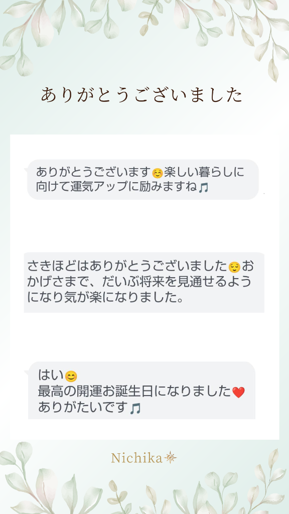 いつも決められた範囲で、あたりまえの日々を当たり前に過ごす・・。そんなの誰もが自分らしくありません。自分らしく、自分の道を進む事1度きりの人生、楽しむ事!!何事も難しく考えられない、単純思考なアドバイザーです。超スーパーポジティブなアドバイスをします。『元気だして!』『大丈夫!』『今からでも遅くない!』いつも思います。お客様の場合は、自分の気持ちに気付いて欲しかった。我慢しないで、伝えられえる人に変わって欲しかった。人に気持ちを伝えるのが苦手なお客様がどのタイミングで、どんな言葉を使えば、相手の心にスッと気持ちが届くのか?私の察知・予知は得意分野です。お客様よりアンケートを頂いたのでご紹介致します♪●セッションの感想家族、子供、仕事、家の購入についてなどなど、悩みの幅は無限大、こんな事まで答えてくれるの?と思う程、相談出来ない事などないと感じています。●どんなアドバイスでしたか?「それの答えはこう、だからこうしなさい。」という、ただ結果だけを伝えて来る事は無く、過程や結果を相談者が自分自身で考え、自分の力で選択したり、答えを模索出来るよう、的確にアドバイスをくれます。セッションでは、いつも気付きを与えてくれます。いつもハッとさせられるような言葉や、心に響く事を絶妙なタイミングで下さいます。気持ちを解ってくれるのが本当に早いです。相談者はその言葉を道しるべとして点と点で結んで行き、最終的には自分自身の力で答えを出す事が出来るようになると感じています。また考えられる力がつくので自信に繋がったり達成感を感じ、より自分自身の足で頑張って行こうという向上心もアップできていると実感しています。●実際に感じた変化以前は、辛い事が起こると気持ちが落ち込み、悩んでいる時間が多くありました。日賀さんとお話をしたりセッションを受け続けていくうちに、悩む時間よりも解決に向けて積極的に自分で考えたり行動したり、物理的に難しい事は早々に諦めたり、気持ちを切り替えて楽しい時間を過ごすように心がけたりと、気持ちの切り替えがとても上手になりました。結果、悩む時間が減り1日1日を有意義に過ごせる時間が増え、充実した暮らしへと変化して行きました。今では自分でも変化にビックリするくらい落ち込む事が少なくなりました。以前までは、悩みに使っていた時間は、子供と過ごす時間へシフトし、日々の充実感は驚く程変化しています。●心の変化気分の浮き沈みが格段と減りました。以前は他人を見ては「羨ましい」「何で自分だけ」などの思いでいっぱいでした。日賀さんのセッションを受けて行くうちに自然と「自分は自分・人は人」とうい考えで、日常生活を送れる様になりました。言葉を押し付けられる事は無く、心から自然とそう思えるように解りやすくアドバイスしてくれます。その結果とても人生が生きやすくなりました。悩みに対しての向き合い方も変わったので、悩みは依然としてあるものの人生の充実感はとても増加しました。昔よりも毎日が充実し、楽しく日々を送る事が出来るようになりました。悩む時間でただただ過ぎて行くなら、日賀さんに相談して努力したり、前進する時間に使おう!そう考えると、以前のようなネガティブな自分は居なくなりました。●Nichikaの印象時には先輩ママ、時には親戚のおばちゃん、時にはお母ちゃん、自分がどんなに極地にいても必ず味方でいてくれる頼もしい存在です。日賀さんご自身の生まれ持った才能だけではない、色々な辛い経験をされ、努力を誰よりもしておられる日賀さんだからこ年齢問わず様々な人に寄り添うことがきているのだと感じています。これからも宜しくお願い致します😆●Nichikaより親戚のおばちゃん!間違いないです!!本当にそう!伝わっていましたね♪お子さんの気持ちも使わってしまいますので、『今おばちゃんお母さんに言うね』何度心の中で思ったか!!お子さんの笑顔や、母子のコミュニケーションが増えたのが嬉しいです!まだ、お子さんの素直な年頃に、素直な気持ちをお母さんに伝えられて良かったです♪お客様も雰囲気が明るくパワフルになりました♪ネガティブはなるべくスイッチを入れない事で、プラス思考になれます♪またいつでも頼ってください。